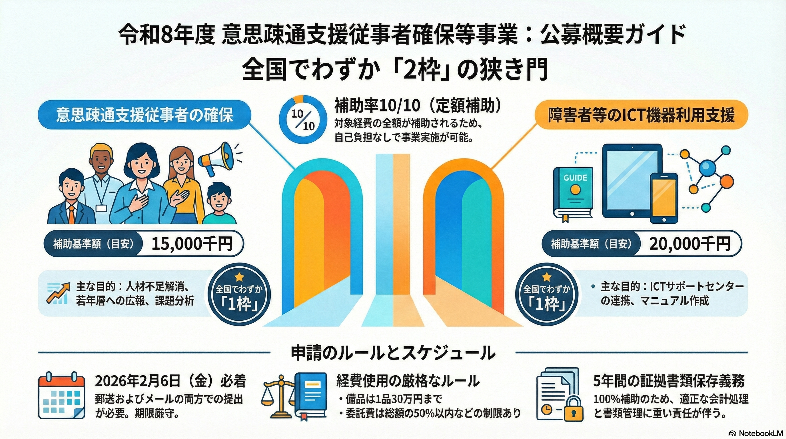 ✅ 令和8年度意思疎通支援従事者確保等事業は、意思疎通支援の担い手確保とICT機器利用支援を、民間団体の創意工夫で前進させる全国公募の補助事業です。補助率10/10という魅力がある一方、各事業区分1団体採択で競争性が高く、成果・体制・経費の妥当性を一貫して説明できる計画が必要になります。