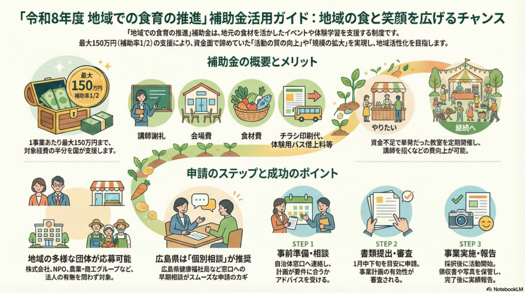 ②補助金による具体的な問題解決イメージ: 上記のような課題に対し、「地域での食育の推進」補助金はまさに救世主となり得ます。先ほどの三次市のNPO法人の例では、この補助金に申請し採択されれば、年間の食育教室開催にかかる経費の半額・最大150万円までを国から補助してもらえます。具体的には、例えば年間200万円の事業計画を立てた場合、うち100万円は補助金でカバーされる計算です。これにより、団体は自己負担を大幅に減らしつつ、質の高いプログラムを継続実施できます。たとえば今まで月1回だった教室を月2回に増やしたり、プロの料理人や農業の専門家を講師に招いて内容を充実させたりといった事業拡大が可能になります。また、参加費を低廉に抑えてより多くの子どもや保護者に参加してもらうこともでき、結果的に地域活性化の効果が高まるでしょう。庄原市の農業法人(仮称)であれば、補助金を活用して都市部の親子を招いた農業体験ツアーを企画し、貸切バス代や保険料など必要経費の半分を補助で賄うことで、安全かつ低コストでイベントを開催できます。安芸高田市の郷土料理伝承グループ(仮称)も、補助金によって古老の方々への謝礼や会場費を確保できれば、定期的に郷土料理教室を開き次世代へ知恵を引き継ぐことが可能になります。いずれのケースでも、補助金によって「やりたいけれど資金が足りない」という壁が取り除かれ、今まで一歩踏み出せなかった中小企業・団体への支援となります。その結果、地域の人々が共に食を楽しみ学ぶ場が増え、地元産業のPRや消費拡大にもつながるという好循環が生まれるでしょう。