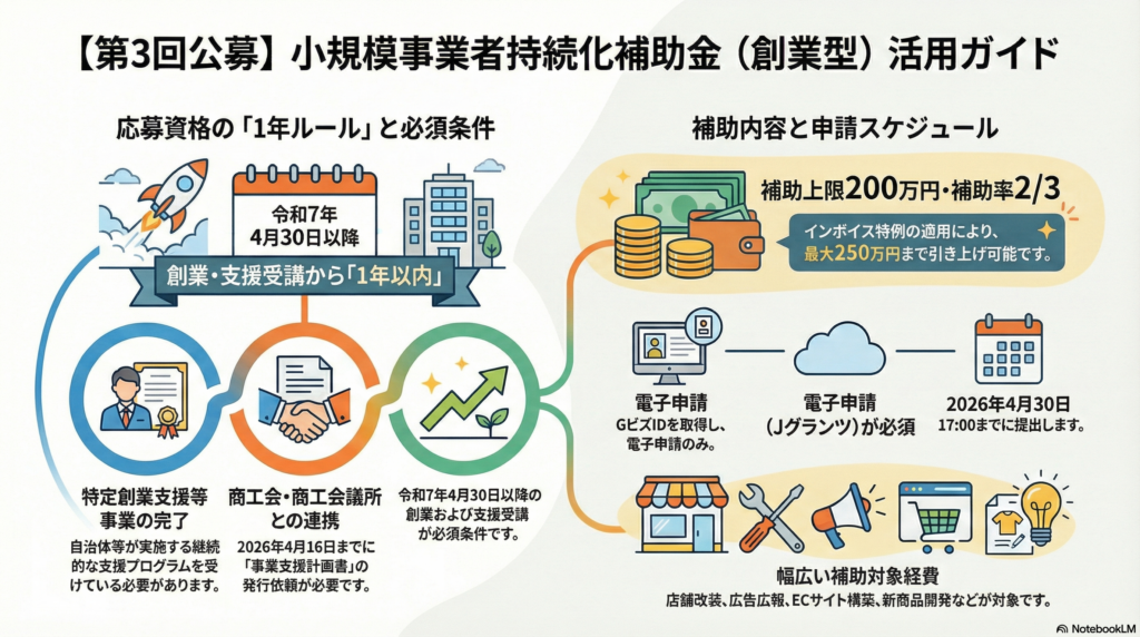 令和7年度補正予算で新設された「小規模事業者持続化補助金<創業型>」は、第1回公募(締切:2025年6月)から始まり、第2回公募(締切:2025年11月)を経て、今回の第3回公募(締切:2026年4月)に至っています。その間に制度面でいくつかの変更が行われています。以下に主な相違点を比較表にまとめます。