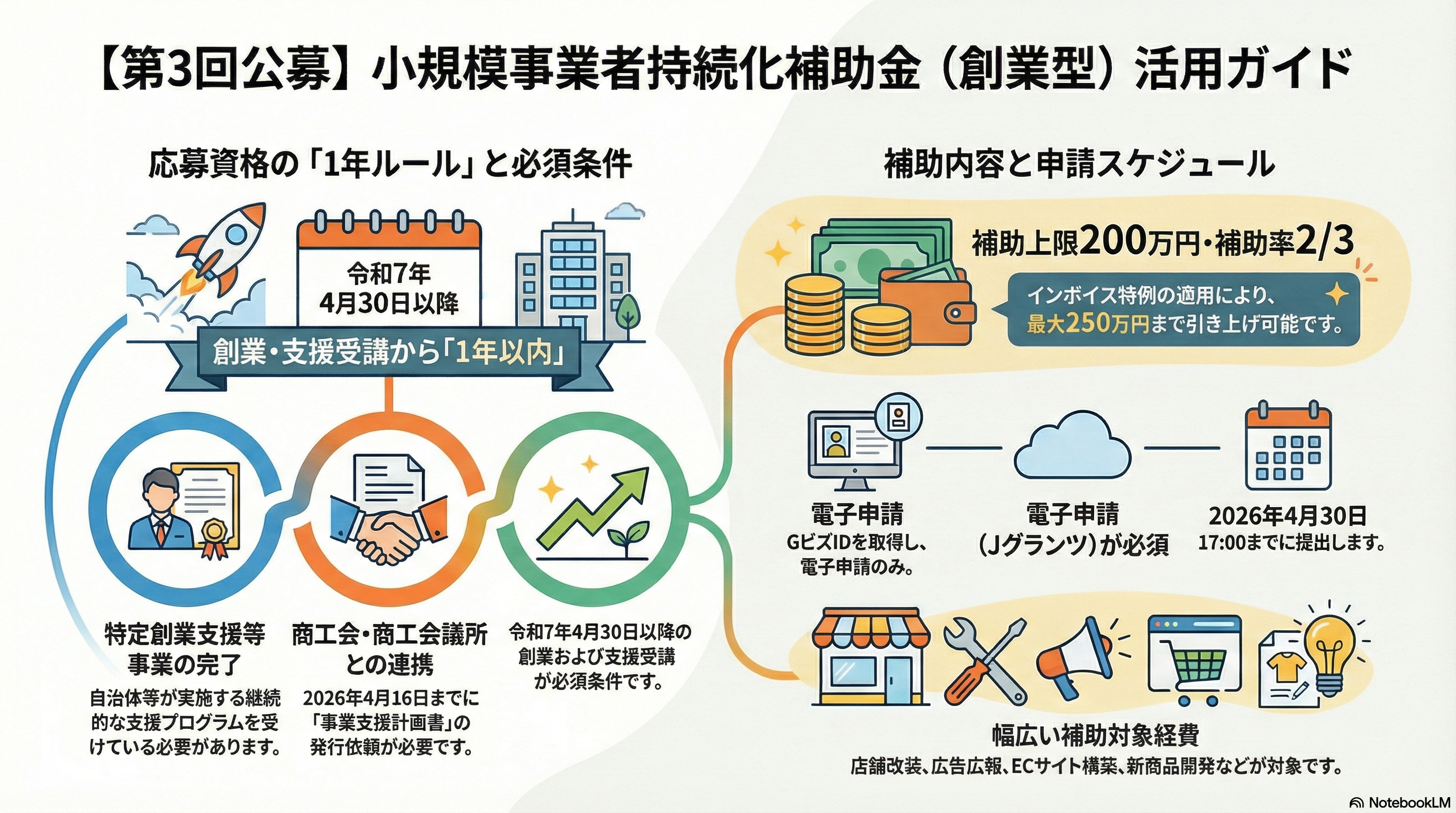 以上が主な応募要件です。要件を満たしていれば、まだ開業準備中の段階(開業届は提出予定、事業開始前)であっても応募可能です。ただし採択後は速やかに開業届出や事業開始を行い、補助事業期間内に事業を動かすことが前提となります。