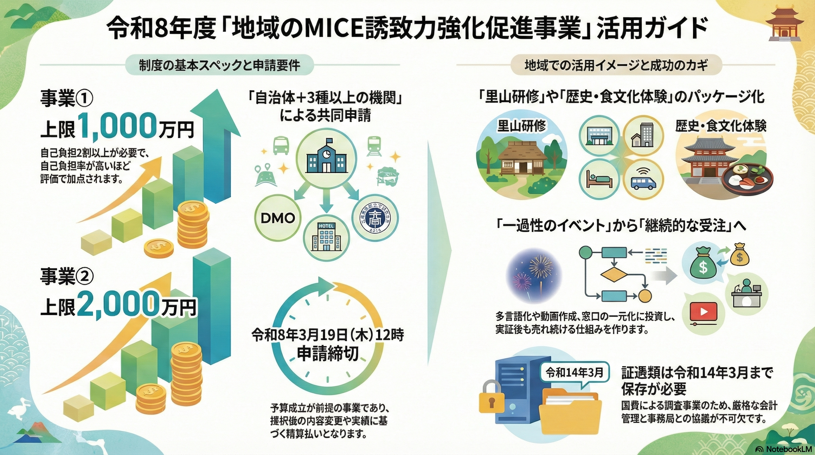 ✅ 本事業は、地域のMICE誘致力を高めるモデル実証に国費を投入する枠組みで、事業①は上限1,000万円、事業②は上限2,000万円が示されています。事業①は自己負担2割以上が要件で、対象経費や対象外経費、二重支給の扱いなど実務ルールも明確です。三次市や庄原市、安芸高田市の関係者にとっては、平日の団体需要を生み、地域の中小企業 支援につながる“売れる仕組み”を作るチャンスになり得ます。