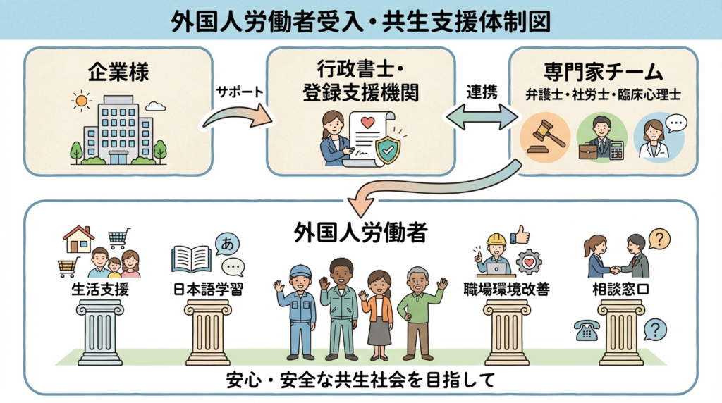 | 生活支援・公的手続き | 住居確保(宅建士連携)、住民登録、銀行口座開設同行 |